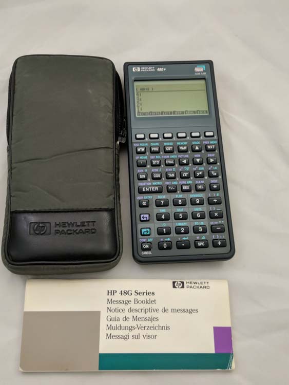 Calculator Hewlett Packard HP 48G+ PLUS with the original HP case and the message guide.